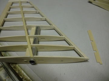 ● スタビライザーの駆動パイプの前後を補強します。形紙の段階で、パイプ孔の前後中心線に2×10mmの孔を開けるべく、最初から角孔を切り取ってあります。此処をトレースして切り抜けると画像の様な案配に・・・。此処にリブピッチに合わせた切り溝を入れて刺し込みスライドさせれば、立派な補強部材の取付が出来ます。後からリブピッチごとの補強材を一枚ずつ貼り込んでも結果は同じ・・・。今回はメインスパーと補強部分が交差するんで・・・この方法を使ったまで。