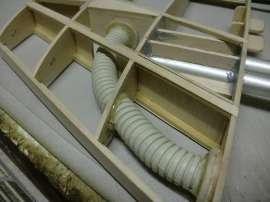 ● 当工房では昔からこの画像の蛇腹のエアコン・ドレーンホースに着目し、機体を設計すれば組み込む前提で使用してきました。リブ材や補強部材を貫通させる場合、その接着に使ったのがグルーガン(別称=ホットメルトガン)です。OK模型ではEZ完成機の治具を大量組み立てる際・・・治具の内部補強材として使っていました。ガンの本体もその後に普及した玩具みたいな小さいタイプじゃなく、インパクトドライバーよりもガタイがデカい・・・更に溶剤の直径も10mm近く長さも30センチ位のサイズ・・・。まあ・・・当り前に使ってたから、何の抵抗も無く使えるんですけどね。