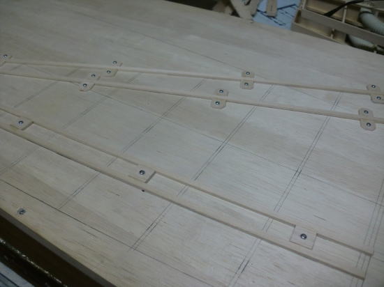 ● この定盤にトレースしてある線は、リブ位置を決める為の本機の上面図です。何故取り外せる様にしたのかと言うと、翼型が変更に成っても組み立て治具は変更に成りますが、リブ位置(リブのピッチ)は変化しないからです。治具は翼型変更で新たに作りますが、このトレースした線上で治具を作れば同じものが組めるんです。よって、今回のリブ組み用の治具・・・今までとは構造が一部違うんですねえ・・・。