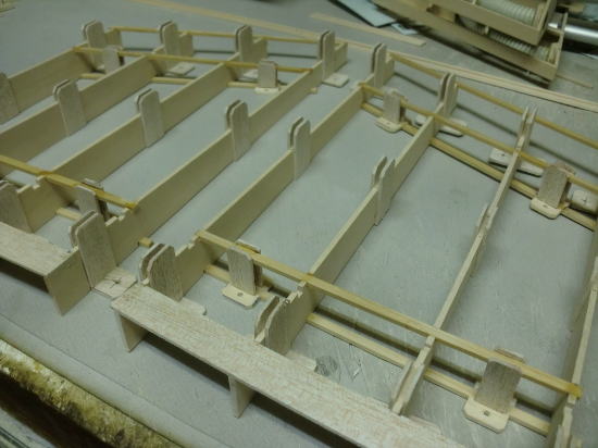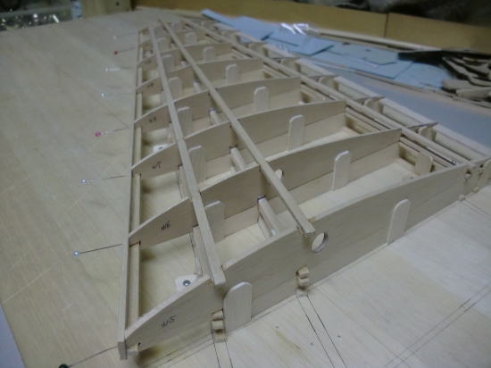 ● 当工房のリブ組み治具の最新版を使うと、治具に固定した状態である程度の部品取り付けが可能に成り、治具から外してもその形状を強固に維持出来るんです。其処から更に部品を取り付けて行きますが、治具から外したリブ組み状のプランク前の主翼なんですが、既にフニャフニャと捻じれる様な構造では無いので、裸の状態でも部品取り付けが可能なんです。OK模型のフィルム張り完成機のバルサ機の場合も、此れと同様です。リブ組み状態で、保管しても経年変化での捻じれ等が起き難い構造で組み立てて有るんですなあ。自作モデラーさんの手抜き前提超軽量な主翼の構成では無いんです。