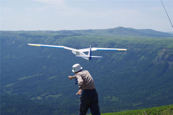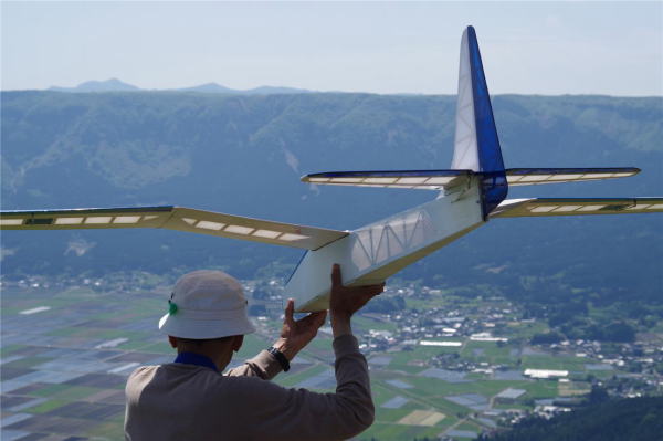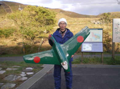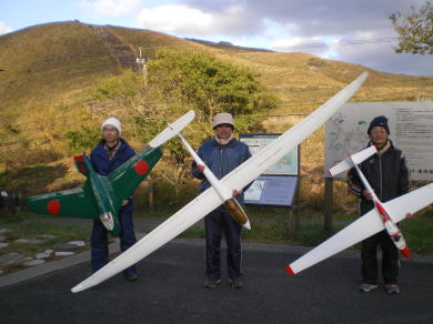 ☀ 大観峰入山のスロープ初心者さんほど機体を投げたがります。投げてもらうと上記の結果に・・・。小型のハンドランチグライダーと大型のソアラーは投げ方を変えないと、必ず失敗しますよ。インストラクターA川氏の上半身をよく見て下さいね。腰の辺りから頭のてっぺんまで、左に傾いてるでしょう。ピッチャーのオーバースローと同じです。機体を水平に投げ様と思ったら、右利きなら身体を左に傾斜させて投げるのが基本です。軽量グライダーは、この必要が無いので、何時もの投げ方でやったため・・・失敗します。軽量機のつもりでヒラリ!っと投げても、初速が無いので揚力が発生しません。「投げましょうか!。」って言う前に、自分で大型グライダーを製作して、投げる練習をしてから自信たっぷりに言って下さいね。初飛行の一投目・・・上記の投げ方されたら・・・その日のテストは終了です。お宿に帰って徹っちん修理は疲れますよってに・・・。