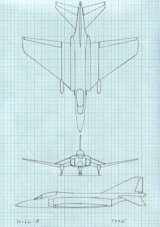 ● F−104J−Xのラジコン飛行機一号機が出来上がった頃、部室の中ではパイロット達がワイワイ言いながらマルヨンのメカ積みをしていました。そこへF−1パイロットがやって来て私にイラストを見せてくれました。そのイラストには何やらアニメちっくな飛行物体が書いてありました。しかし、よく見てみるとそれはファントムベースの飛行機でした。ファントム・パイロット達はそのイラストを見るなりいきなり騒ぎ出し、これも作れと私を御だて始めました。そこで、このファントムSFバージョン機を作る代わりに、マルヨンの2号機から4号機まではパイロット達に作ってもらう事にしました。材料は刻んであるので組むだけなんですが、彼らははっきり言ってキット製作はズブの素人集団です。空中分解だけは避けたかったので上官であり年上ですが、心をゴジラにして指導させてもらいました。気持ち良かったですよ〜、上官に向かって命令出来るのは・・・・・。