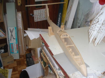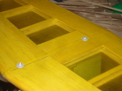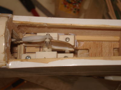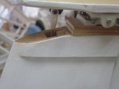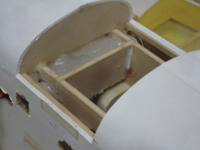 ● メカ室は3mmのムクのベニヤで保護されています。これは後から入れたのではなく・・・最初に胴枠の内側にボックスを作ってから胴体外部のストリング材を機体側面に這わせて側板を張り込んでいます。よって外部側板には裏打ちの補強板を入れなくてよくなるんですよ。何故ならハードランディングで外部側板が凹もうが割れ様が・・・、胴体の修理は全て外部からの作業だけで済んでしまうからです。内部側板と外部側板の隙間に橋桁を埋め込んで、その上から破損して切り取った側板材のパッチを接着してやれば良いのです。ね!無駄な二重構造って機体修理が簡単でしょ?。