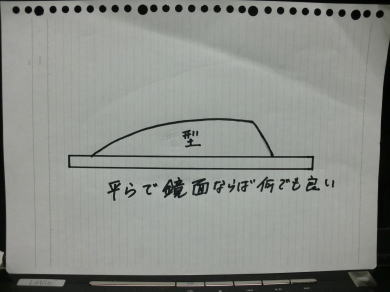 âãã»ãããŒãã貌ã蟌ãã ãããã£ãããŒåãå°ã«åºå®ããŸããé¡ã®æ§ãªç¡¬è³ªã®ã¬ã©ã¹ããããã¯éæ¿ã»ã¹ãã³ã¬ã¹æ¿ã§ãè¯ãã§ãããæšæã®å¹³æ¿ïŒåã¿ã®ããæ¿ïŒïŒïŒïœïœä»¥äžïŒã«åžã¬ã ããŒãã貌ã£ãŠããã£ãããŒåã眮ããŸãããã®æã«ãã£ãããŒåãåããªã工倫ãããŠäžãããåã¿ãæãã°å°æ¿æ¯ãã¹æ¢ãã§ãæ§ããŸããã