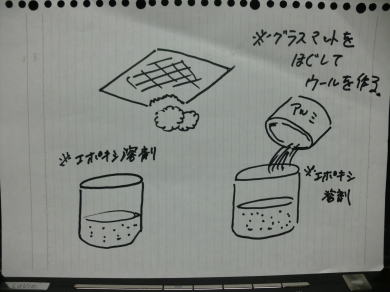 âããŸãã¯ã¡ã¹åã®è£œäœã§ããã°ã©ã¹ãããã貌ãèŸŒãæº¶å€ãšãã¢ã«ãã®ç²ãæ··ã蟌ãã æº¶å€ã®äºã€ãäœããŸããã¢ã«ãæ··å