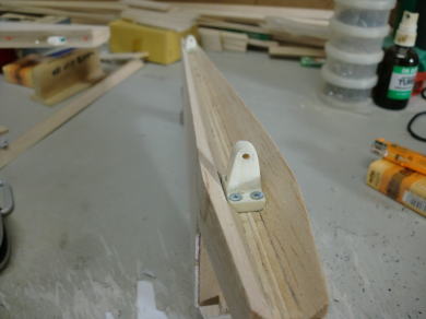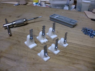 ● PVC樹脂の棒材を加工してブラケットを作りました。このブラケットは垂直尾翼(バーチカル)と水平安定板(スタビライザー)の後縁側に其々ビス止めします。金属製の板ヒンジは其々昇降舵(エレベータ)と方向舵(ラダー)の前縁に埋め込んで接着します。樹脂製のブラケットには3mmのビス孔をタップを使ってねじ山を刻んでいます。此処に板ヒンジのインチサイズの孔からミリ規格の3mmドリルで孔を開け、ビスを差し込んで固定しています。要するに・・・このビスの中心がヒンジラインって事に成るんです。