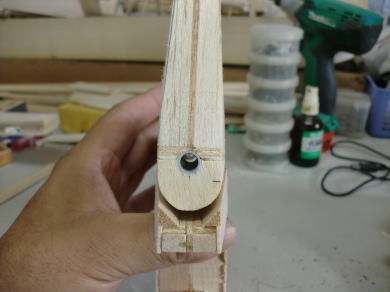 ● キット指示では、固定尾翼側の後縁も動翼側の前縁も・・・軟鉄の板ヒンジを、キット付属の割ピンで結束するんですが、確実な動きを確かめるには・・・挿入した割ピンの先を広げて折り曲げないと確実性はありません。何度も抜き差ししていたら・・・何れ金属疲労で軟鉄の割ピンは折れてしまいます。更に・・・この僅かに空いた隙間にラジオペンチの先で、割ピンを入れて差し込まなければ成りません。拡げた割ピンの先を綺麗に元に戻さないとピンは抜けませんし・・・。そういった作業性の悪さを改善する意味も有り・・・こういった面倒臭い構造となりました。詳しくは(ASK-8・Part-9)辺りから記載している尾翼の工作記事をご覧下さい。