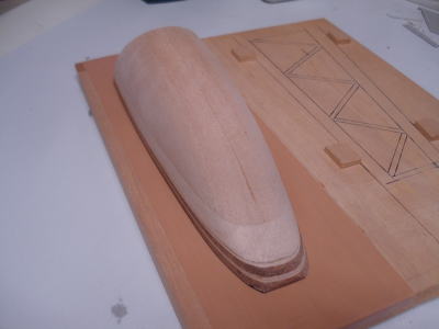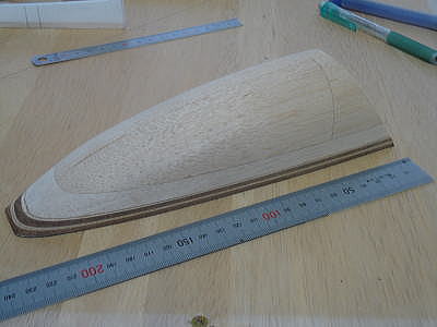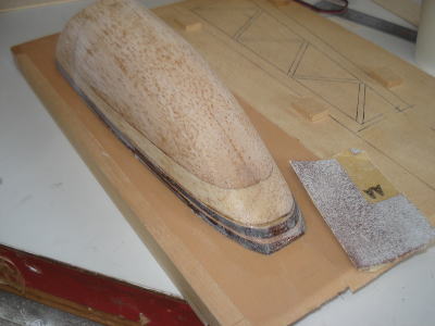 ● 24時間後の木型の表面は大変硬いので、80番程度の荒めのサンドペーパーで全体をサンディングします。バルサ自体を積層した部分には細かい溝が出来ていますので、ペーパーを集中して中てながら溝の深さを軽減させます。急いで力を込めて削る必要はありません。あまり切削面に荷重を掛けずに、少しずつ滑らかにして行きます。急ぐと一箇所に集中してペーパーが当たり・・・バルサの生地が露出してしまいますので充分注意してサンディングしましょう。一層目と同じ量のエポキシ溶剤を木型表面に刷毛塗りして行きます。今回は下地が既にある程度硬い状態で固定されていますので、硬化剤を多めに入れて硬化時間の短縮を図ってみました。約16時間後には二層目の切削が可能に成ろうかと思います。