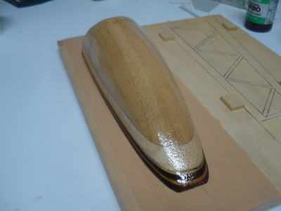 ● 木型の表面を出来るだけ滑らかに仕上げます。左の画像ではまだバルサ材の仕上げ面の状態です。右画像はエポキシの溶剤を一層目・塗り終えて硬化させています。急がないので24時間硬化させました。まだ・・・表面に光沢はあるんですが、デコボコしています。