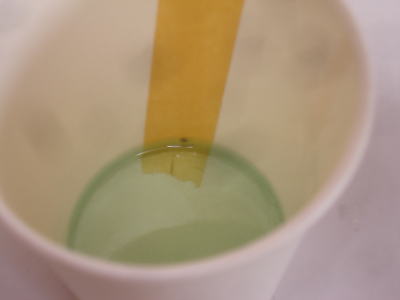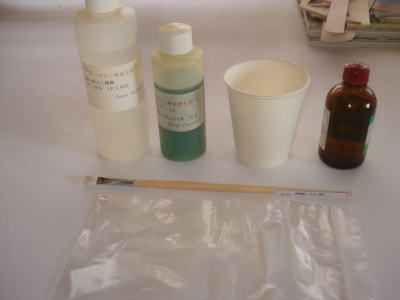 ● 用意する物はエポキシ溶剤と紙コップ・筆洗浄用のアセトン(ターボの小瓶入り)です。世の中にはウレタンシーラーなるハイテク溶剤も存在してるんですが、木工の家具それも極めて高級感漂う家具の塗装の下塗り行程に使う積層剤です。木目の美しさを強調する場合は、仕上げにクリヤのウレタン塗料を吹き付けて紫外線を多量に照射出来るチェンバーに通して細かいゴミを焼き尽くし釜を出る頃には鏡面仕上げの高級そうなテーブルが仕上がります。直接紫外線が皮膚に触れたら?・・・、火傷もしますし、最悪皮膚ガンも待っています。よって、木工家具屋の塗装屋さんではありませんので、そこまで行かない表面処理です。