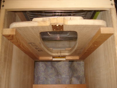 ● 右の画像は型押し盤を下から見上げてみたところです。実際・・・使用する場合は、目と指先をフルに活用してシートをたるませます。シートのどういう状態が型押し可能な状態なのか?・・・、これだけは確実に「こうです!。」と断言出来る状態がありません。私の4年分の型押しデータは季節毎の室内の気温・暖房炉の中の温度・型押し盤に掛ける熱源の時間・使用するシートの板厚等・・・、大学ノート2冊分あります。しかし。実際に使用されるマニア諸氏の工作室の状況が必ずしも私のデータに全て合致するとは限りませんので、一般的なデータは掲載出来ますが、詳細なデータは意味が無いと思いますので掲載は控えさせてもらいます。