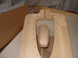 ● 中央の画像は型押しをする時の私の目線です。型押し盤を両手でしっかりと持ち、木型にシートを押し付けて行きます。主要なアール面を通過したら、型押し盤を二つに割ります。蝶番で吊ってあるので左右綺麗に割れるハズです。木型の側面にシートを巻き込み・・・、木型の下面に来たら型押し盤をもぐり込ませてシートを引っ張ります。この引っ張り動作によりキャノピーの側面が木型に密着します。