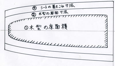 ● 上記イラストは木型の寸法取りを示した図です。右のイラストに示した通り木型の床面積に左のイラストに示した寸法を足していきます。3番の寸法までがシート枠の切り抜き寸法になります。木型下部まで巻き込む訳ですから木型の前後にも余裕が必要になります。ただ巻き付けるだけでは無く・・・、少し押し付けてキャノピー上部のアールに沿わせてから巻き付けていきますが、ある程度の熱源でシート自体を軟化させなければこの成型はできません。そのシートを軟化させる技術と巻き込むタイミングが、この成型器を使いこなすコツになります。