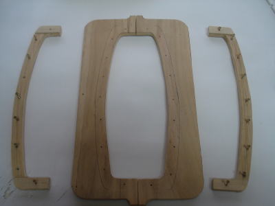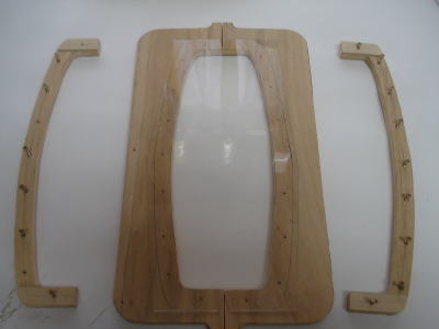 ● 上記のイラストから作図した型押し板の完成画像です。左側がハンドランチ用の細身に型押し板・右側がロックウェルカナードの型押し板です。ひだりの画像はハンドランチ用ですが、シートの固定位置がカナード機用とは逆に設定してあります。型押し板の板厚が邪魔して巻き込めないので、この取り付け方法となりました。幅が60mm程度までのキャノピーの木型ならばカナード機用の通常タイプの型押し板で可能なんですが、幅の狭いキャノピーの場合は木型を固定している支柱の板厚が干渉して来ます。金属板の支柱なら板厚3mmでも充分な強度を持っているんですが・・・、日曜大工のマニアの方には難しい構造になりますのでこういう造りの木型固定台としてあります。