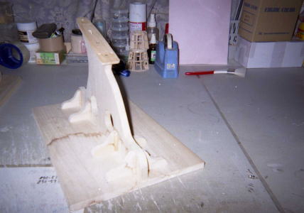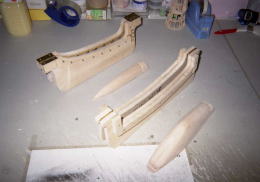 ● 画像の木型はNV−01型・デルタグライダー用です。バルサは通称バランと呼ばれる程に硬い材質のスーパーハード・バルサから削り出しています。木型に使うバルサの基本は、高熱のシートを直接密着させるので、熱で縮まないのが原則です。バルサ同士を接着して木組みとする場合も木工ボンドや瞬間接着剤は使いません。必ずエポキシ接着剤を使ってください。木工ボンドは熱で溶けて木型が緩みますし瞬間接着剤は木型の収縮に耐えられず、割れてしまいます。