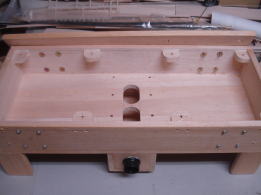● 床板と支柱を固定する時の補強材の入れ方の一例です。一応型押し盤を折り曲げた時に私の手の甲が当たらないサイズの補強材を設定して取り付けてあります。接着剤には30分硬化のエポキシ接着剤を使いました。支柱の高さに対してはかなり低い補強板なので、左右に4箇所ずつ合計8箇所で支柱を支えています。この補強板の各角の小口は荒めのサンドペーパーをしっかりと当てて怪我をしない様に丸みを付けてあります。