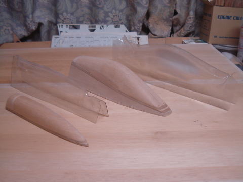 ● ロックウェルカナード機のキャノピーと超軽量ハンドランチグライダーRINDY−T型ベースのスケールグライダー用のキャノピーです。シートを熱源でたるませたら、少し押し付けて巻き付けて引っ張り込む・・・が、ひとりでギュ〜の基本工程です。この工程の動作を一回の動きで連続して行います。巻き付けて引っ張り込んだらしっかりとテンションを掛けたまま持ち、水の入った霧吹きで冷却します。熱が収まり枠が外れたらこの状態です。簡単そうなのでいい加減に作ると失態の連続です。最悪手の甲の筋を切断するかもしれない・・・大事故に発展します。ただし!これは多分この辺を手抜きで作るだろうと予想された箇所を手抜きで作った場合です。此方が絶対手を抜くなって言っても、作業性が悪いから!と位置付けして手を抜きます。運良く成功すれば「トンビは大げさですよ〜・・・!。」となるだろうと思うんですが、全員が同じ結果には成りませんので、安全重視のマニアは実行してください。トンビは大げさ〜のネット物知り博士・・・その後右手の甲を15針縫いました・・・。言わんこっちゃ無い・・・。