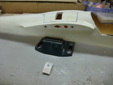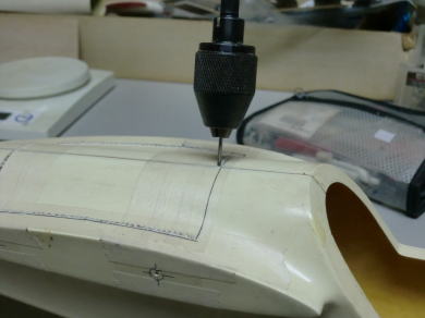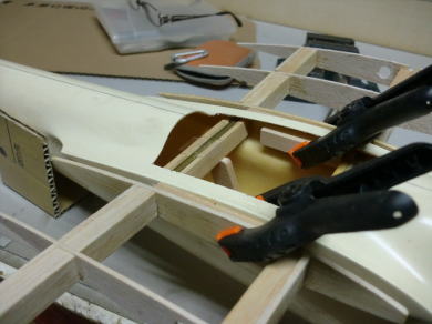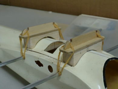 ● 位置さえ決まれれば・・・補強堅木の内寸を調整してカンザシパイプと併用し、エポキシ接着剤で埋め戻してやれば良い訳ですよ。此れだけぶち抜いたんだから、内部は見渡せますよね?・・・。堅木と胴体内部のグラス面には隙間が有る訳ですが、こういった箇所にエポキシを練り練り詰め込んでも・・・流れちゃう事も有るんですが・・・バルサ片を細かく切って盛ったエポキシめがけて隙間に差し込んでやると・・・毛細管現象と表面張力で流れ出る筈のエポキシを止める事も出来ます。エポキシが硬化したら、再度練り練りしてエポキシを盛ってやると、更に強度が上がります。ご存知この位置は重心付近・・・。少々盛ったって大きく重心位置がテールヘビーに成ったりしないんですなあ(笑)・・・。