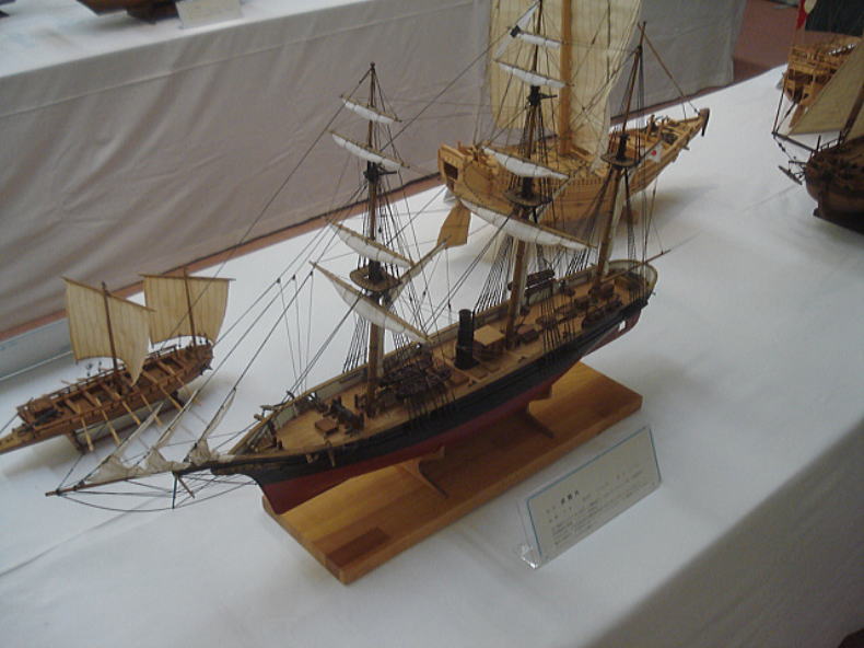 ● 出たああああ!。近代動力搭載のスクリュー船「咸臨丸」です。船体ど真ん中に突き出た煙突が新しい世の中の幕開けを象徴しています。又しても・・・グライダーに例えるなら・・・モーターグライダーですね。自然エネルギーの風力でも走行出来るし・・・、エンジンを動かしてスクリュー航行も出来る・・・近代船ですねえええ・・・。日本人に生まれて良かったあああ!って思わず模型を目の前にして・・・ガッツポーズしてました。