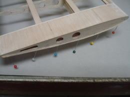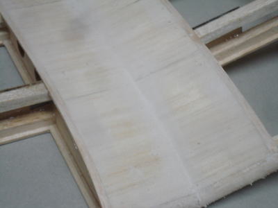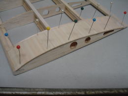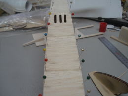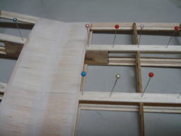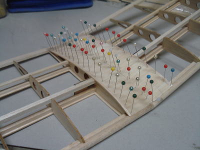 ● 主翼の結合が完了したら上面プランク材の接着面が滑らかに貼れる様に出っ張り等を修整します。上面のプランク材の貼り込みには木工白ボンドの速乾を使用します。ボンドを塗り広げたら先程のプランク材を貼りこんで行きますが、左右のプランク材を間違えない様に接着して下さい。マチ針は間隔を詰めて確実に接着してください。ボンドが完全に硬化したらマチ針を抜いてバルサパテを用いて小穴等の修整をしておきます。