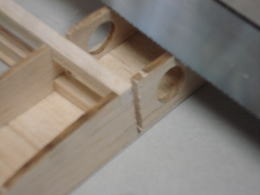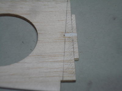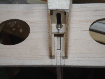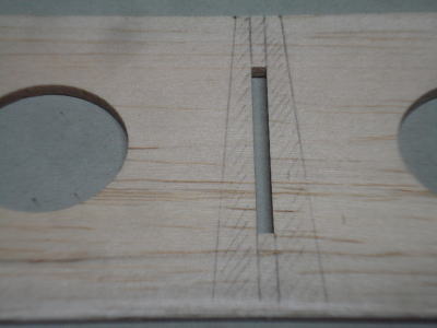 ● 左右の主翼を結合する為のベニヤ・カンザシの入る溝を作ります。メインスパーの直ぐ後ろを幅2mmで切り落としてください。田宮のレザーソウは薄刃ですので加工し易いと思います。少々広くなっても構いませんので下面のプランク材は必ず残して、内部の出っ張り等が残らない様に綺麗に削り取ってしまいます。右画像は厚さ2mmのベニヤのカンザシ板です。何やら中央に埋まっている様に見えますが・・・、実際に直径2mmのピアノ線が封入してあります。ベニヤと言えどもマニアの機体の扱い方は千差万別ですので、荷重オーバーのGを掛けるかもしれませんので、主翼のバンザイ対策だと思ってください。カンザシ板の中央に印を付けて溝に差し込んでください。
