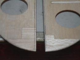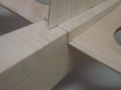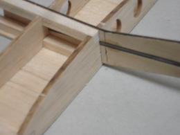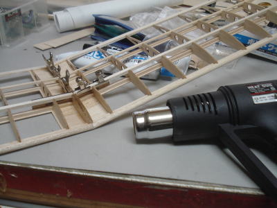 ● 主翼の結合はエポキシ接着剤を使って片翼ずつ行ってください。この時余ったエポキシ接着剤の混合溶剤はカンザシ周りのリブやスパー材の接着面に盛る感じで塗り込んでおくと、更に強度が増します。片翼が完全に硬化したら結合するリブ面にもエポキシ接着剤をたっぷり塗り込み接着します。この時ヒートガンを使いエポキシを柔らかくすると、細かい隙間にもエポキシを充噴させる事が出来ます。しかし、温度が高すぎるとエポキシ溶剤が泡を吹きついでにバルサ自体を歪ませる事もありますので注意してください。