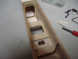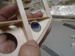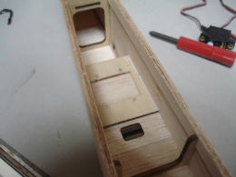 ● 加工したサーボマウントを胴体の中のこの位置に接着剤で貼り込みます。接着剤が硬化したらサーボマウント内部のバルサ面をくり抜いて下さい。