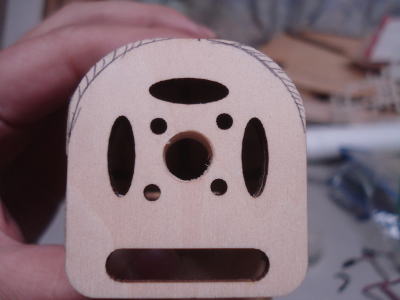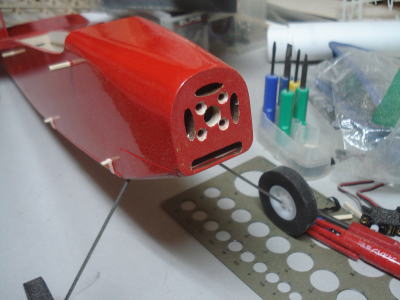 ● ノーズ先端は上手に削り込めば上部は20R下部は5R程度までなら大丈夫です。マウント内部のバルサの厚みと相談しながら更に個性的な顔にも変身出来ると思います。モーターシャフトの穴についてなんですが、箱詰めギリギリになってから代理店から連絡が入りGWS2205は初期型のEリングタイプから直径の大きいストッパータイプに変更になった事を聞き、慌てふためいてしまいました・・・。リーマーを使って直径9mmまで広げてあるんですが、更に余裕を見て10mm程度まで広げてください。直径8mmのバルサの丸棒をセットに入れておきますので、お手持ちの両面テープを貼りこんで此処に120番程度のサンドペーパーを貼り付けてご使用ください。
