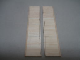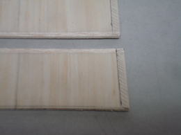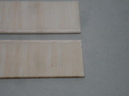 ● この様な形状のバルサシートが入っています。画像の様にカットして下さい。片側3mm程度残してカットするのが良いと思います。この棒材をプランクシートの端に貼る事でプランク材の割れの防止とリブのアールに沿い易い反りを実現できます。右画像の様に小口は直角で落としてください。