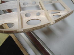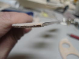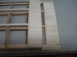 ● 翼端材の高さの成形に入ります。画像では翼端材がリブ面よりも高いので隙間が開いています。この隙間が無くなりリブ面に均等に沿う様になったら翼端材の面は翼型に沿う形に成形されたという事になります。