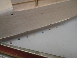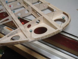 ● リブキャップならぬスパーキャップを取り付けます。まずリブ溝にスパーキャップを仮にはめ込み、翼端材に溝を付けます。スパーに木工接着剤を薄く塗り込みスパーキャップを接着します。キャップは長めになっていますので、翼端材のアールに沿ってカッターナイフで切り取ってください。この接着にもマチ針が効果的だと思います。