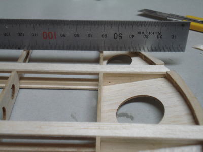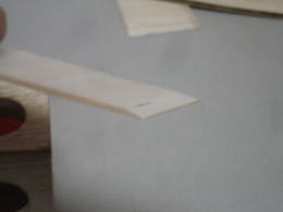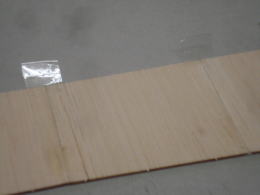 ● 先程加工した中央翼のリブプランク材の寸法加工をします。中央翼のリブは一回り小さく作られて組み込んであります。プランク材を貼りこむ事でその他のリブとサイズが同じになります。後縁材に突き当たりで主翼下面と同じ様にリブに沿わせて寸法を決めます。前縁の丸棒の中心ぐらいで寸法をカットしてください。後縁側の突き当たりの時セロテープで固定すると寸法が出し易くなります。寸法が決まったらもう一度セロテープを使って、中央翼リブ上面に仮固定してください。