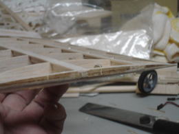 ● 中央翼リブのプランク材は幅を少し広めに取ってあります。主翼をひっくり返して、はみ出した余分なバルサシートをリブに沿ってボールペンで線をケガいてください。ややアールがかった線が引けたハズです。これは上半角の為リブが傾いて組み込まれているからです。線の外側・約1mmを残してカッターナイフで切り落としてください。主翼の前縁側は丸棒ですので中央画像の様に約4mmの幅で線を引き、斜線部分を右画像の様に斜めに削ってください。削った先は目見当で0,5〜0,8mm残れば良いと思います。要するに1mm弱という事です。
