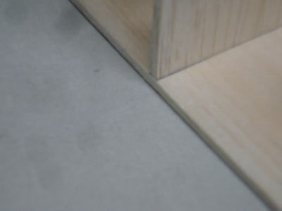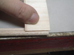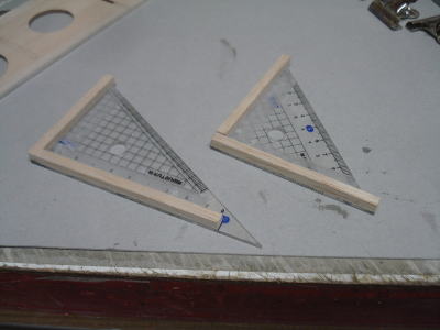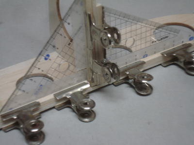 ● 上記の画像は100円均一ショップで購入した三角定規に両面テープを貼り、バルサの角棒を固定しただけの垂直出しの冶具です。垂直尾翼(バーチカル)に木工接着剤を塗り込んで、この冶具を取り付け乾燥させています。