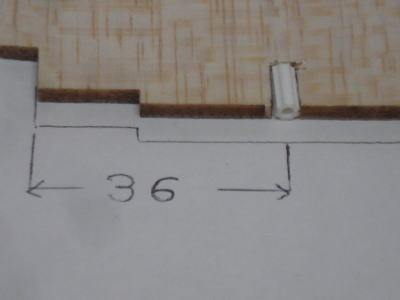 ● 垂直尾翼(バーチカル)を一部加工します。この星型パイプを長さ8mmでカットします。(セットに20mmで付属しています。)寸法の右側が機首側になります。そこから36mmの所にパイプの中心が来る様に尾翼の下面を加工して下さい。パイプの付く面の出っ張りは水平尾翼の指定の溝に勘合するのですが、二段目の角が水平尾翼(スタビライザー)の前縁と揃わない時は画像左の様に一番下の左角を削り落として調整をしてください。