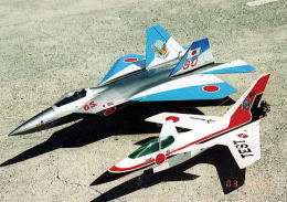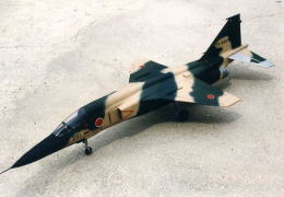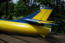 ● エグゾーストの形状が変わっている様に見えるんですが、ジェッティーなマニアには理解して貰えないかもしれませんね〜・・・。このダクトは斜めにカットされた変形ダクトなんです。ジェット噴流の噴射力を変化させる事によって複雑な推進角度を付けなくても良い様に最初からモーターの推力線に迎角を付けてありません。ダクトの上部付近は下部よりも長いのでダクトの表面には多くの渦流が発生します。下部のダクトは上部よりも短いので渦流の発生が少なくて済みます。結果的に上部の空気流の速さよりも下部の空気流のスピードが速くなりますので、アップスラスト効果が生まれます。ジェットタイプの機体はノーズモーメントが長いので空力的にジェットの推力線にアップスラストを付ける場合が多いのですが、模型のダクトの推力と実機ジェットエンジンの推力には比較にならない程の差があります。もっと簡単な構造で調整出来ひんやろか・・・と考えて、全て仮定の範囲からスタートしたアイデアなんですが、大御所の中には早速自分の機体で試した方もおられますよ。調整次第だとは思うんですが、フルパワーとミニマムパワーで姿勢変化が若干見られたとの事でした。そこはフラッペロンとエレベータのミキシングをスロットルと合体させれば解決出来る様です。