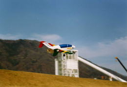 ● テスト飛行の場所に選んだのは俵山です。動力機なのに何故お山なのか・・・。理由はただ一つ・・・。ブ〜ン・ガチャンのタイムラグが長いからです。落差を利用すれば壊れる・墜落するはかなり遅くなります。運良く浮き上がれば続けて飛べるかもしれません。この時のお仲間さん全員が「絶対!飛ばん!。」っと言っていました。テストフライヤーの羽山さんだって半信半疑でした。元々