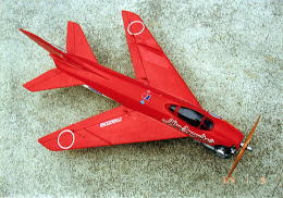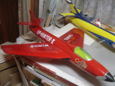 ● フェラーリレッドで仕上げたハンターのB型機です。前作ベニヤとバルサで構成されたハンターA型機は4セル仕様機だったんですが、このB型機は基本内部構造体を5mmのスチレンペーパーで構成した3セル仕様機です。本体サイズは前作と同じなのですが、内部構造の見直しにより更に軽量化された機体に仕上げてあります。機体表面は全てバルサで覆ってありますので、高温タイプのオラカバドライフィルムでも難無く貼り込む事が出来ます。本機は最初の予定通りに一体型で製作しました。ブラックマウンテンキリシマ・ハンドルネーム:ミ・ツ・イ(ラジコン飛行機タダ貰い専門恐喝窃盗グループ主犯格)の訳の解からない攻撃が無かったら・・・、空野さんの機体がもっと早く仕上がって垂直上昇発進を決めていたかもしれません。
