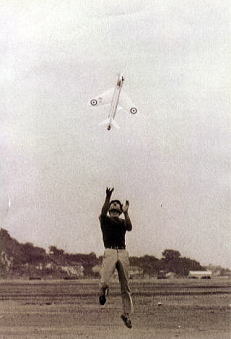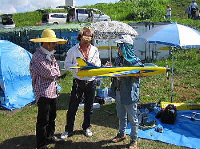 ● 画像は第6回のんびり飛行会でのハンターの飛行準備の模様です。ハンターの製作と同時進行でEP-GANBAの擬態ゼロ戦もテストしました。ハンターを持っておられるのがグライダーインストラクターの羽山さんです。今回操縦を担当するのはテンガロン・ハットのWBO氏・・・麦わら帽子がハンドカタパルトの極楽さんです。ハンターのアウトラインは40年前の空野さんの機体と同じ造りにしてありますので、手投げも同じ要領で投げれば良い様に・・・最初から極楽さんのハンドカタパルト仕様で設計しました。