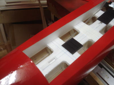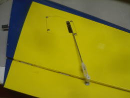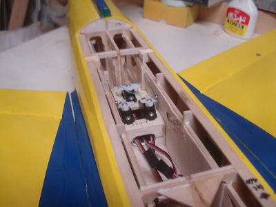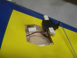 ● エルロンサーボの取り付け状況です。パークフライ専門のネット物知り博士の多くが、スチレン製ファンフライの流れ其のままに、堅牢バルサ機のサーボ取り付けを幅の広いセロハンテープで固定して時速150km以上で飛ばしているのを知ったら・・・、誰もが怖い!って思うでしょうね。本機の構造を参考にして私を見下ろし目線で小馬鹿に出来る位確実なメカの固定方法を模索確立させてみましょう!。