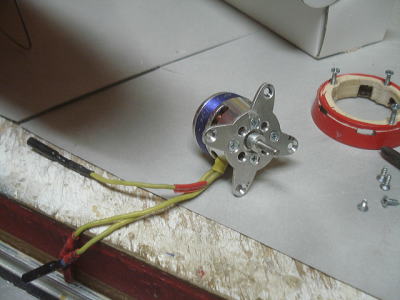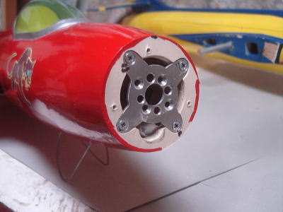 ● 本機のモーターマウントの内部構造です。2mm厚のアルミマウントを加工して取り付けてあります。マウント前方の輪っかは、コレット部分で延長されますので、その胴体ノーズカバーの役目をするモノです。