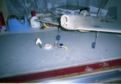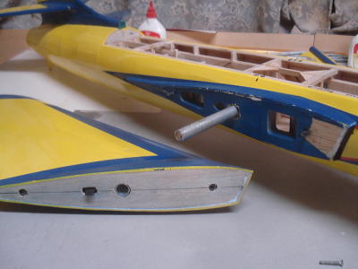 ● アルミマウントにモーターを固定したら胴体内部に組み込み・・・、コレットを差し込んでからスピンナーの後部プレートを取り付けます。本機の場合はセミオーダーシステムですので、発注される場合は御使用予定のモーターとコレット・スピンナーを送って下さい。それらに合わせて専用マウントとノーズ付近の細かい形状を調節します。尚!空野さんの強い要望ですので、本機を含めた空野さんの機体には(電動ダクトファン)仕様機への改造等はやりません。それが条件です。どんなに高性能なユニットが開発されたとしても一部の愛好家のみの満足しか得られない機種は・・・ロングセラー機種には成らないのが世の常なんですよ。古きを知り新しきに活かす・・・を原則にこの空野さんの機体は進化して行くでしょう・・・。因みにネット掲示板のうけ狙いで余計な改造をして設定を変えちゃうから飛ばし難い(空野機)になってしまうんですよ。内部構造は変化させてもアウトラインの設定を一切変更しなければ、空野さんと同じ性能を完全にコピー出来る飛行機が出来ます。世の中に沢山おられる改造大好きのネット物知り博士?、最初は完全コピーから始めましょう。それからオリジナル性を発揮して飛行性能が落ちない?レベルの大改造をやった方が、成功率は遥かに高いと思います。