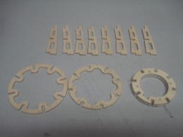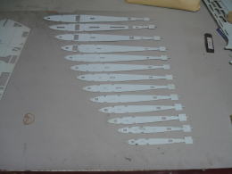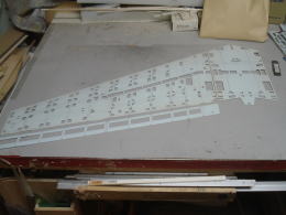 ● 上記画像はコメートの型紙の一部です。これらのパーツは全部5mmのスチレンペーパーから切り出します。下画像中央はリブの型紙です。何やら複雑な内部の孔加工が見えると思いますが・・・、このリブを切り出したら上下二枚に分割します。5mmのスチレン翼の上下二面に其々貼り込んで行く為です。上の右画像は地図にも見えるんですが、この指示された部分に其々のパーツを貼り付けて構造体を組み上げて行きます。仕上がった翼の表面は全てバルサで覆われていますので、フィルム張りは勿論の事シルク張りも紙張りも可能です。長い切り溝はサーボのハーネスのトンネルになる部分です。一つ一つのパーツを先入れで組めるので仕上がって行く過程を自分で納得しながら作業が出来ます。