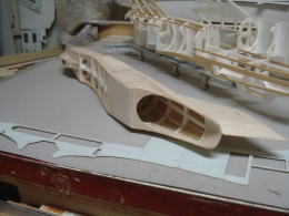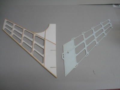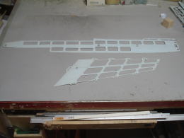 ● 上記の画像は空野氏の図面より複製したロックウェッル・カナード機の内部構造です。まず原寸図面をもう一度引き直してから形紙を取ります。胴枠はオリジナル機では3mmバルサのムク板なんですが、本機では5mmのスチレン板を使用しています。これをリンケージに合わせて設計段階から効率良く肉抜きしておきます。グラム単位で量れる計測機をお持ちの方は一度量ってみてください。10cm角の5mmのスチレン板と同じ比重のバルサ板は1,5mmの同寸のムク板とほぼ同じです。更に肉抜きすると1mmバルサの同寸よりも軽くなります。しかし、1mmバルサの胴枠にパネル甲板張りは難しいですが、糊代が5mmもあるスチレン板は2mm以上の接着面を確保出来るのです。
