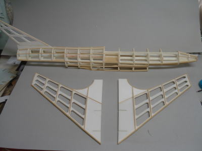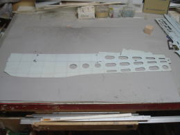 ● 空野氏の機体の多くは完全対称翼が多いので図面のリブ型からスチレン材の板厚を引いた残りの翼型をシート両面に貼り込んでいきます。もう大概のマニアは解かっていると思いますが、形紙から採寸して切り出し2枚重ねてペーパーを当てたシートのサイズは左右とも同じサイズで仕上がっています。全てのバルサ材の貼りこみ作業工程がスチレンシートの内部だけで行われるのでアウトラインの形状が左右とも同じに仕上がるのです。シートのサイズが同じならフラットボトム翼でも半対称翼でも同じ仕上がりになります。生地完成状態の外部表面は全てバルサ面で覆われていますので、フィルムの種類を選びませんしマイクログラスも絹張り仕上げも可能です。
