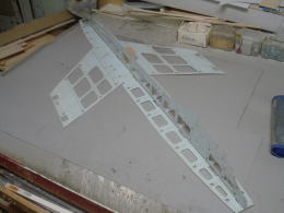 ● 胴体内部はスチレンの肉抜きフレームですので構造体が確定しているのなら、余計な部材はカッターナイフで取り去っていきます。のこぎりも要りませんし、ペンチも使いませんので加工は大変し易いと思います。この構造の基本体はネットショップ・ポキールームのタイガーシャークにあります。試作型を一機譲って貰ったのですが、スチレン機に自由にフィルムが貼れたり塗装が出来たりするにはどうしたら良いだろう・・・と思案を廻らせた結果がこの構造に行き着きました。
