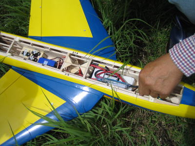 ● ほぼメカ配置も空野オリジナルと同じ位置に搭載しています。さあ!どうなったでしょうか・・・?。続きは飛行動画を準備中です。結果を少しバラすとすれば・・・誰もが半信半疑の中、落差を利用して加速し引き起こしたらそのまま急上昇して大きく水平旋回に・・・画像俵山の風景を左から右に高速でパスして行きました。そこで映像は止まってるんですが・・・墜落したから!ではなく、飛ばないって思っていた飛行機が普通に飛んだ事と、あまりのスピードの速さにテストフライヤーの羽山さんが慌ててモーターカット!。そのまま草むらに不時着したからです。動画は20秒程度ですが、その加速と水平飛行時の座りの安定性は空野さんオリジナル其の物でしたよ。(動画は此方から)