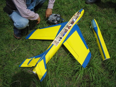 エンジン設定機です。全く同じ設定で動力のみ4セルブラシレスです。俵山のマニアさんにとっては私は無名の完成機屋さんですからね・・・誰も飛ぶなんて思っていません。むしろ・・・落っこちてバラバラになれば大いに馬鹿に出来るし、ストレス解消には持って来いのシチュエーションでした。