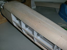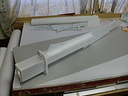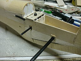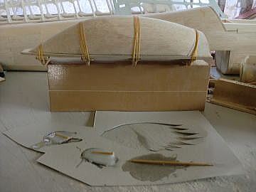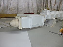 ● F3A機のノーズらしくなって来ましたねえ・・・。スピンナー後方の胴体下部の膨らみ・・・この内部に本来ならノーズストラットギヤのリトラクトが収まります。今回は此処のスペースには、一個50グラムの標準型デブサーボが3個埋め込まれ、エレボン仕様のスタビライザーとラダーに夫々リンケージされます。本来のF3Aならリトラクトの上には、350ミリリットルの燃料タンクが収まるんですけど・・・。無動力のガチスロなモンで・・・。