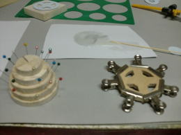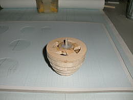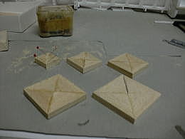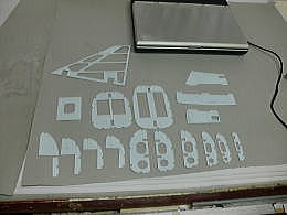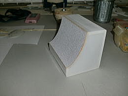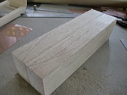 ● 真空成型を使う木型は、硬ければ硬いほど良いですよ。今回使ったのはスーパーハードバルサです。木村バルサに注文するときは、木型に使うと明記しておけば、このスーパーハードバルサが送られてきます。硬いって事は糸鋸盤でも手強い材質です。硬いので其れなりの丈夫な鋸刃を使って下さいね。急がず時間を掛けてゆっくり切り出しましょう。切り口が奇麗なので後処理が楽に成ります。切り抜いた不要な部分も大切に残して下さいね。木型は側面のアールだけ切り抜ければ良いんじゃないんですよ。今度は両面テープを使って、不要な部分も貼り込んで直方体の形に戻します。